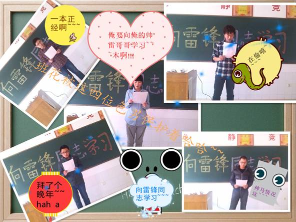 我们学校开展了雷锋宣传实践活动,学习雷锋精神如何融入到现实的学习生活中去,我们班的同学在班上慷慨激昂的发表的自己的看法建议~~~~~~~要实事求是,扎扎实事(认真听讲啦),讲求实效,不要搞形式主义(抄作业啦)。