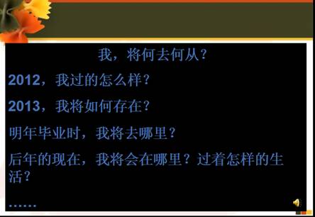 (1)“我将如何存在”。 本学期是11网络1班在校学习的最后一个黄金学期,为了督促大家珍惜时间、尽早的为自己制定职业目标而开展本次班会。