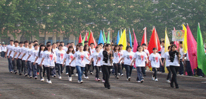 精彩的入场式是运动会看点的一半,在运动会场上,有序的各系学生代表队手握五颜六色的彩旗,随风飘扬。整齐的队伍,整洁的服装,清新的面貌,我们共同迈着有节奏的步伐,朝着前方的道路看去。那一刻,我们精神抖擞;那一刻,我们神采飞扬;那一刻,我们信心十足。我们一起高喊着响亮的口号:青春无畏,逐梦扬威;友谊第一,比赛第二。