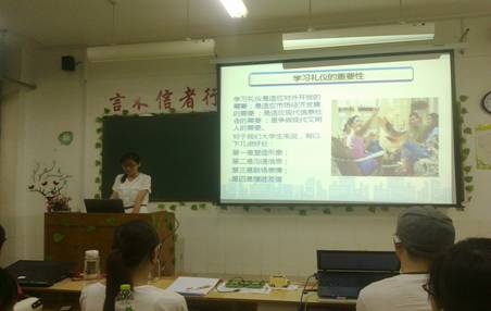 接下来,向大家介绍了仪容仪表仪态、化妆、着装准备、握手、语言文明礼貌、校园文明等方面的内容。