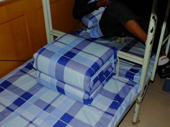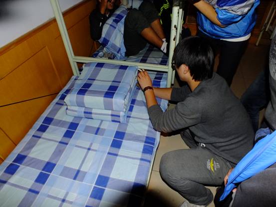孙文浩学长代表自律部,对我们的内务进行了指导,特别是对于同学们比较关心的内务整理和检查标准,学长进行了详细的讲解,包括整理宿舍的注意事项、扣分标准等等。之后,学长现场教学,给我们的宿舍提出了许多意见,例如鞋子摆放不整齐、被子不整齐、卫生不好等等。在同学们的要求下,学长亲自给我们做了示范,教我们如何摆鞋子、如何打扫卫生、如何整理被子,我们大家听的特别认真。特别是看到学长用较快的速度整理好了内务,我们都觉得非常惊叹。