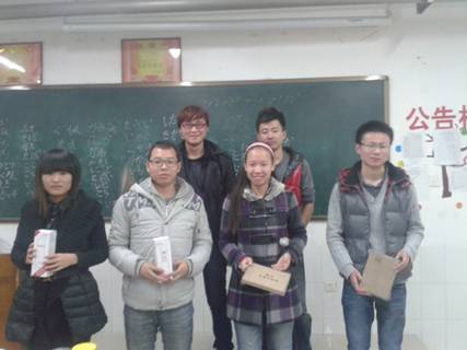 比赛于2013年11月27日晚上在教学楼512举行,经过精彩激烈的角逐,客观公正地评比,把三个环节的成绩总计出来,词汇接龙比赛获胜的小组为三组成员:王婷婷、宋江湖、胡佳晓、阮敬钱、谌敬超和刘盼。