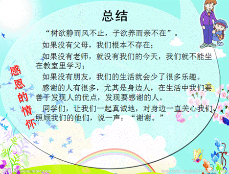 班会意义:借助本次活动,让大家学会感恩,不要把家长、父母的爱当作唠叨,让同学们行动起来,一个温暖的电话、短信问候,一个好的学习成绩,一件贴心的衣物都是对父母、对师长很好的感恩。