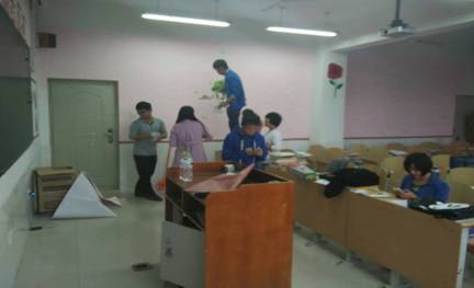 在贴墙纸时同学们积极配合班委工作,将一块一块的墙纸贴到墙上,大家早上出去采购及打扫卫生,整整忙了一天,同学们为了赶时间有的中午饭都没有吃,终于一天下来,也算有了成果,整个教室变得焕然一新,到处充满温馨。