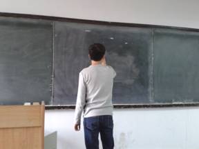 上课之前总有同学主动把黑板、讲桌擦干净,准备好粉笔、投影等必需用品,图为潘思刚同学在擦黑板。