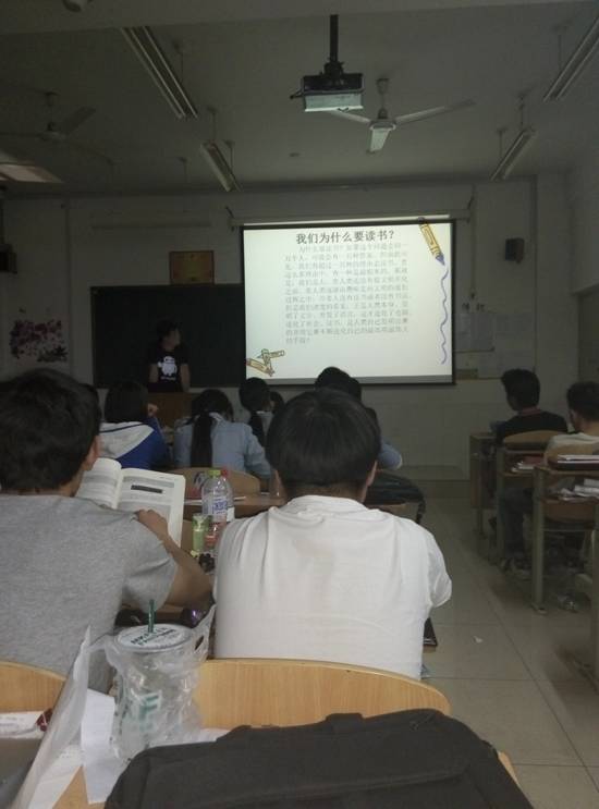 七时许班会召开。本次班会班主任徐娜老师也参与进来。首先,团支书从“你觉得读书重要吗?”和“我们为什么要读书”两个问题展开班会内容,简单明了的点明了读书的重要性。然后又让我们了解了名家读书,然后和一些的趣味的读书知识问答,这让我们的班会气氛更加愉悦。团支书又详细的列了一些读书的好方法,针对我们大学生不爱看书提了几条中肯的建议,让我们受益匪浅。最后班主任徐老师让同学们自己谈对读书的看法,同学们都畅谈所言,每个人都把自己对怎么读书,读什么书详细的说了出来,让我们更了解彼此。