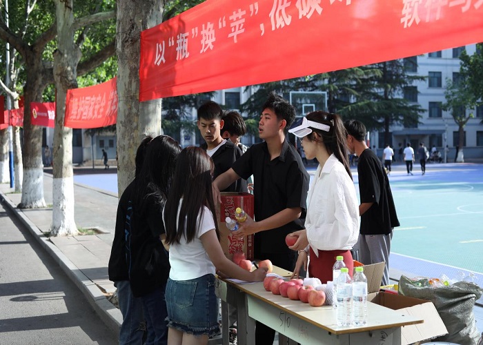 5月12日,软件与大数据系在奎文校区组织开展“爱心环保,以‘瓶’换‘苹’”绿色环保公益志愿服务活动,全体师生参加。