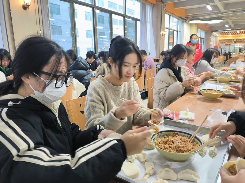 活动开始后,切菜、剁肉、调馅、和面、擀皮,师生们分工协作、配合默契,一边包饺子一边分享包饺子的技巧和心得,并交流了学习和生活中的趣事,现场温馨祥和。经过两小时的努力,热气腾腾的饺子出锅,师生们围坐一起,共同品尝了自己的劳动成果。
