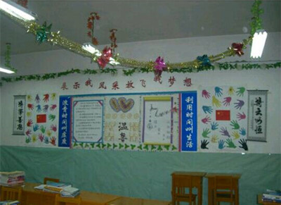 班长带领我们把一张张同学的照片整齐的贴在墙上向大家展示自己,对墙面进行了贴剪纸,做宣传板,挂条幅,在讲台上放一些小盆栽,在墙壁上展现我们辉煌的战绩。