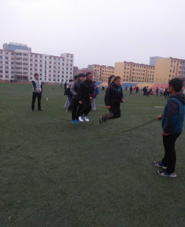 下午下课后操场上早早的就有人在准备着,同学们跳着,笑着,挥洒着青春的汗水。有的人被绳子绊倒了,大家没有指责,而是相互鼓励支持。我想,这便是成功的支柱,团结的桥梁。