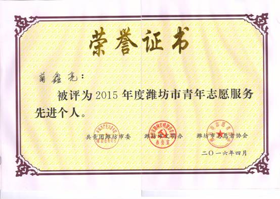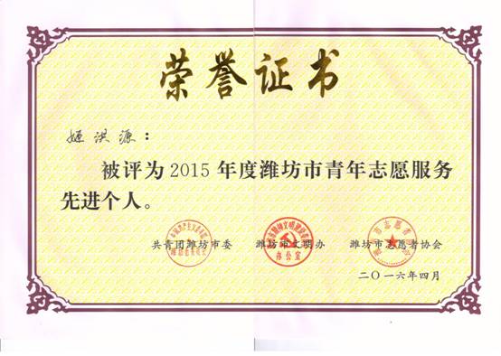 我院软件系青年志愿者服务队被共青团潍坊市委、潍坊市文明办、潍坊市志愿者协会授予“2015年度潍坊市青年志愿服务先进集体”荣誉称号;软件系蔺鑫亮、姬洪源两名同学被授予“2015年度潍坊市先进个人”荣誉称号。