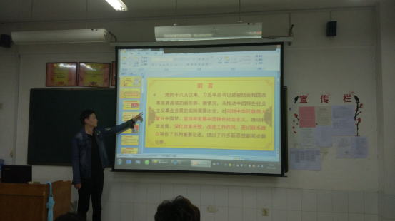 将习书记的讲话放在word文档,班长刘国锋通过班里的投影仪给大家播放ppt,给大家展示习书记的系列讲话,组织委员王光瑶为大家进行讲解,班里的同学放下手中的事情,认真学习习书记的系列讲话,并且团支书将习书记的系列讲话上传到了班级群里,让同学能够下载学习习书记的讲话,使同学们思想上有了很大的提升,并且是同学们增强了上进心和自信心。