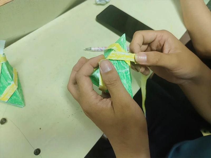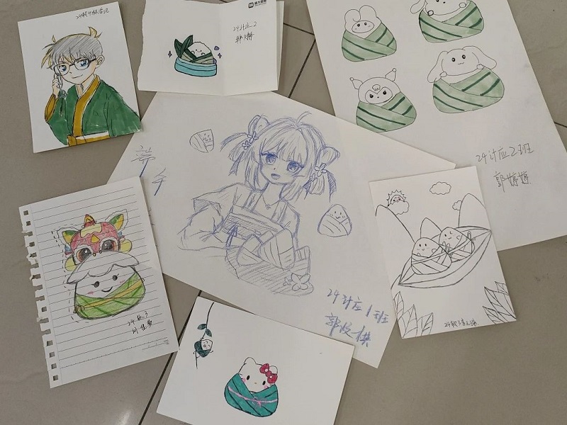 在“浓情端午 共庆佳节”主题活动中,80余名同学以端午元素为灵感,将传统民俗与现代动漫艺术相结合,精心绘制Q版粽子动漫形象,并用卡纸、彩绸等材料制作立体纸质粽子手工艺品。在创作过程中,指导教师同步讲解端午节的历史渊源、民俗习惯及文化内涵,引导同学们在动手实践中感受传统文化的独特魅力。另外,软件与大数据系20名志愿者组成“青银服务队”走进胡西社区,开展“端午共此时 青银巧手汇”民俗体验暨政策宣传活动。志愿者们与社区居民围坐一堂,共同进行粽叶清洗、糯米浸泡、粽绳捆扎等包粽子环节,在手把手教学中传递节日温情。活动期间累计制作爱心粽子200 余个,部分成品被送往社区孤寡老人家中。与此同时,志愿者们协同社区工作人员,向居民发放民政救助政策手册300余份,针对低保申请、特困人员供养等政策要点进行细致解读,现场解答群众问题,切实将惠民政策送到百姓手中。