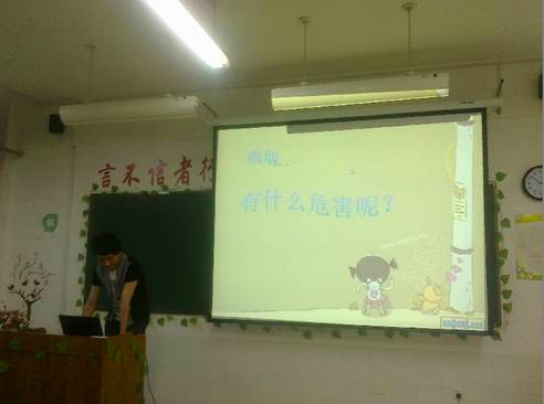 班会开始,杨凡同学首先介绍了向大家提问吸烟的危害,调查大家对其危害的认识,同时也调动了大家参与班会的积极性。下面是班会现场照片。