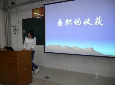 三、“兼职的收获”主题班会。作为即将走上社会的大二生,我班同学根据自己的爱好与学科的长处,分析自己所适合从事的行业,制定就业计划,于是在班主任的主持下,我班召开了“兼职的收获”主题班会,在班会中,我班每个同学都讲述了自己曾经做过的兼职,并分享自己在兼职过程中的酸甜苦辣。大学生做兼职不仅仅得到了经济上的报酬,更重要的增强了与人沟通的能力,获得了工作经验,个人的实践能力得到了提高,同时也认识了自身存在的不足,增加了找工作的筹码。