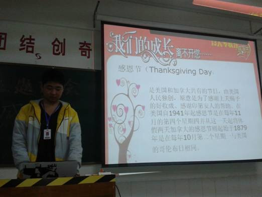 感恩,是我们当今社会比较热门的一个话题。在西方传统节日--感恩节到来之际,13大专软件1班举行了一场以“感恩”为主题的班会。本次班会由宣传委员蔺新亮同学主讲,通过组织同学们观看有关感恩的大型讲座、感恩视频以及感恩题材的文字材料展示,让同学们重新认识了“感恩”二字的深厚文化内涵。