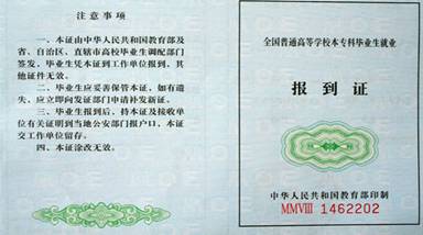 (3)《报到证》。《报到证》分上下两联(内容相同),上联(蓝色)由校就业指导中心寄发给毕业生,下联(白色)则放入学生档案内(人事档案属国家机密,不允许个人持有。如果你的用人单位拥有档案管理资格那么你的档案就放在单位;如果没有,那你的档案放在人才市场类的档案保存处。若你没签就业协议书,那你的档案就直接打回原籍)。而《报到证》则交由你手自行保管。在这里必须要重点说的是,很多人在毕业后没多久就把《报到证》丢了,而当若干年后单位希望将你提干要求出示《报到证》时,很多就没有了,而只能再跑回某地去重新开证明,这时的证明可就没那么好开了,所以一定要保管好《报到证》。