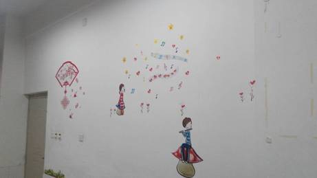 为了体现我们班级的特色,基于大部分同学都有着深厚的美术功底,我们采取手绘画的形式对教室后墙进行美化,教室四周的墙面采取贴画的形式进行美化,最终经过全班同学一个周的努力(特别是毛轶男、裴玉娇和牛宝坤,牺牲了休息时间),我们班焕然一新。