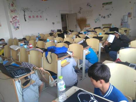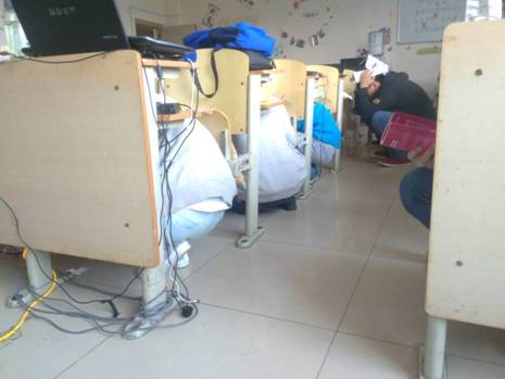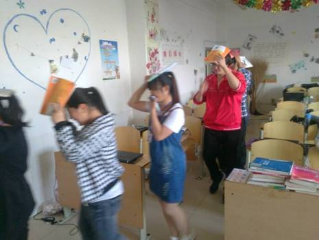 在警示铃声刚刚响起时同学们第一时间保护好自己头部,然后迅速反应寻找藏身地方。