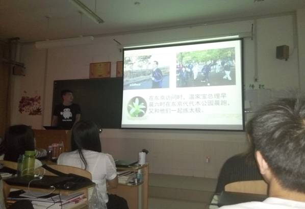 班会时间定在周天晚自习,当晚班主任徐娜老师也参与到班会之中。团支书以课件的形式向同学们展示了这一班会的内容。主要内容从每天的运动量,自己的身体状况,体育锻炼带给我们什么和如何体育锻炼四大方面进行论述。还列举了几位名人的锻炼方法,让同学们了解了各国领导人在工作繁忙之余是怎么进行体育锻炼的。最后总结了我们当代大学生该如何进行体育锻炼,简单的给同学们列举了几条适合我们现在的体育锻炼项目。