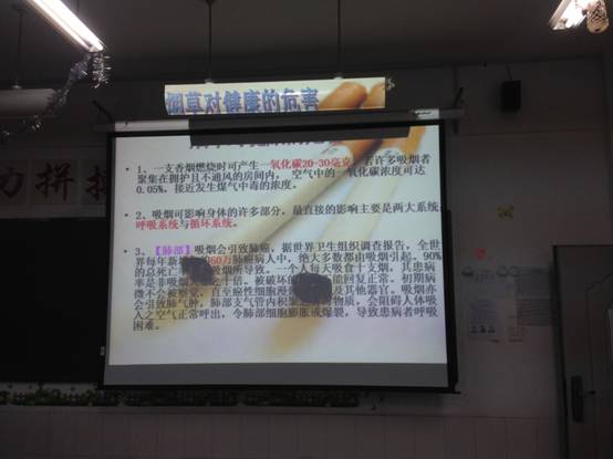 众所周知,吸烟对身体的危害性极大,每年患肺癌的人数也不断增加,然而在校园这种公众场所吸烟的同学,也不在少数,所以,为了同学们的健康,我们班进行了一次以“吸烟有害健康”为主题的班会。