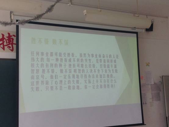 首先,我们给同学们讲了一个故事:历史上的楚汉战争初期,刘邦屡败,特别是项羽巨鹿之战大胜之后看不起刘邦,多次放走他。刘邦最后通过自身的努力终于使项羽四面楚歌!通过这件故事我们可以看出,一个人自信过头就会给自己带来不可预料的灾难,而失败后仍然坚持,那么终究有一天会取得胜利。