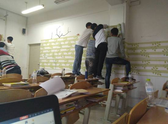 10月18日的下午,班长购买了壁纸打算给大家创造一个更好的学习环境,班里的同学积极响应,纷纷从宿舍赶来美化班级。大家分工合作,小心翼翼的装饰着我们共同的“家”。进行到一半时,还有同学自发去为忙碌出汗的大家买回饮料。短暂的休息过后,便又投入到热火朝天的工作中。