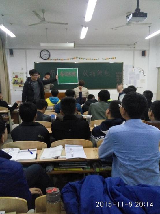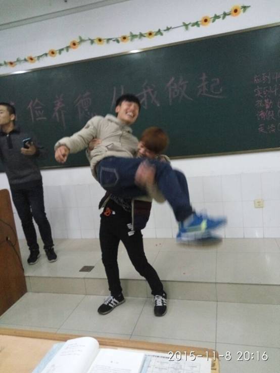 软件七班没有召开班会,而是做了一个充满童趣的猜字小游戏。两个人为一组,一个人做动作,另一个猜成语,不仅考验双方的默契度,更是对同伴的一种信任。没猜出答案的一队要接受大家三个要求,同学们纷纷奇思妙想,有的人说公主抱,摸大腿,广场舞,秀恩爱。我们都开怀大笑,时间就是匆匆的流逝。马上就到了下课了,我们依旧流连忘返。